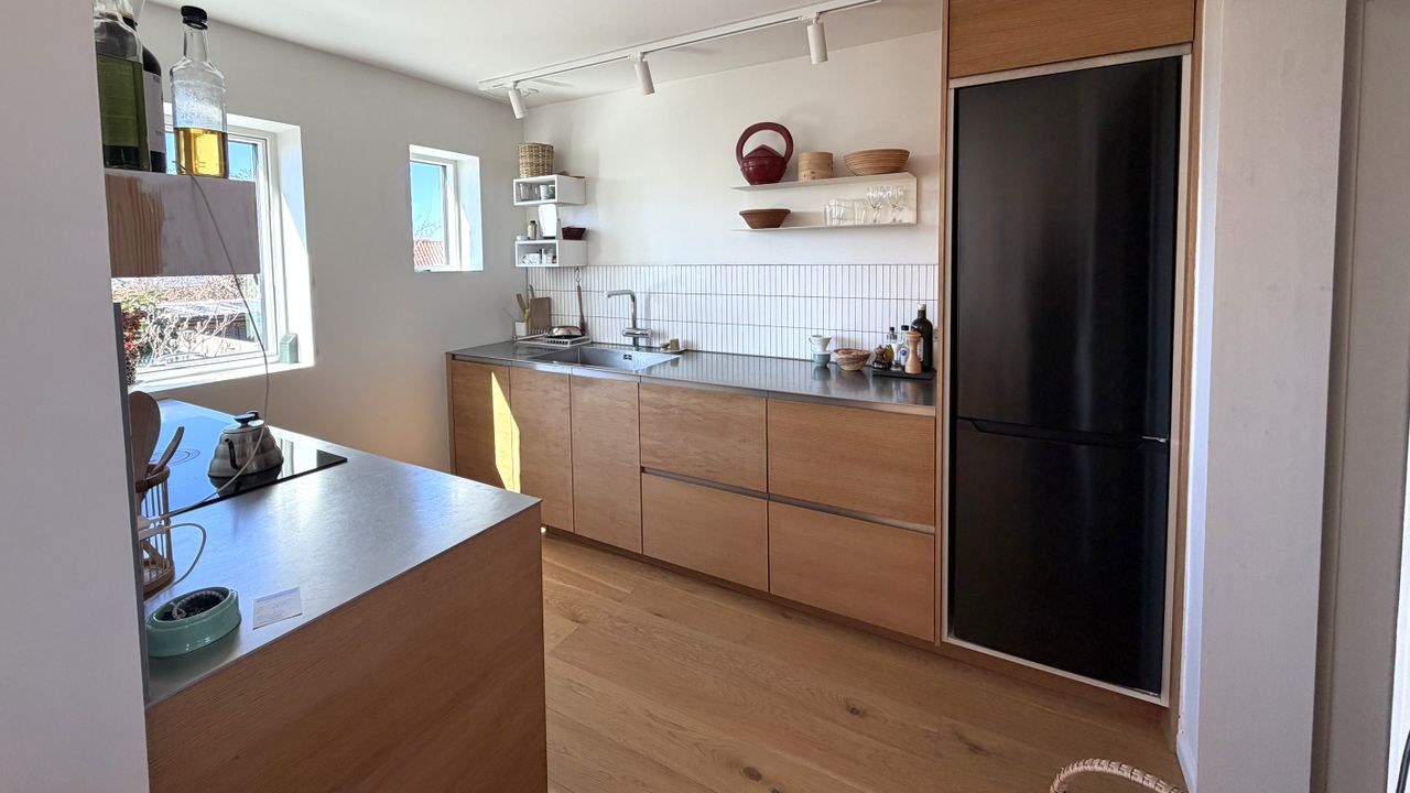 Køkken med kvalitets hårde hvidevarer i åbent plan til spisestue.