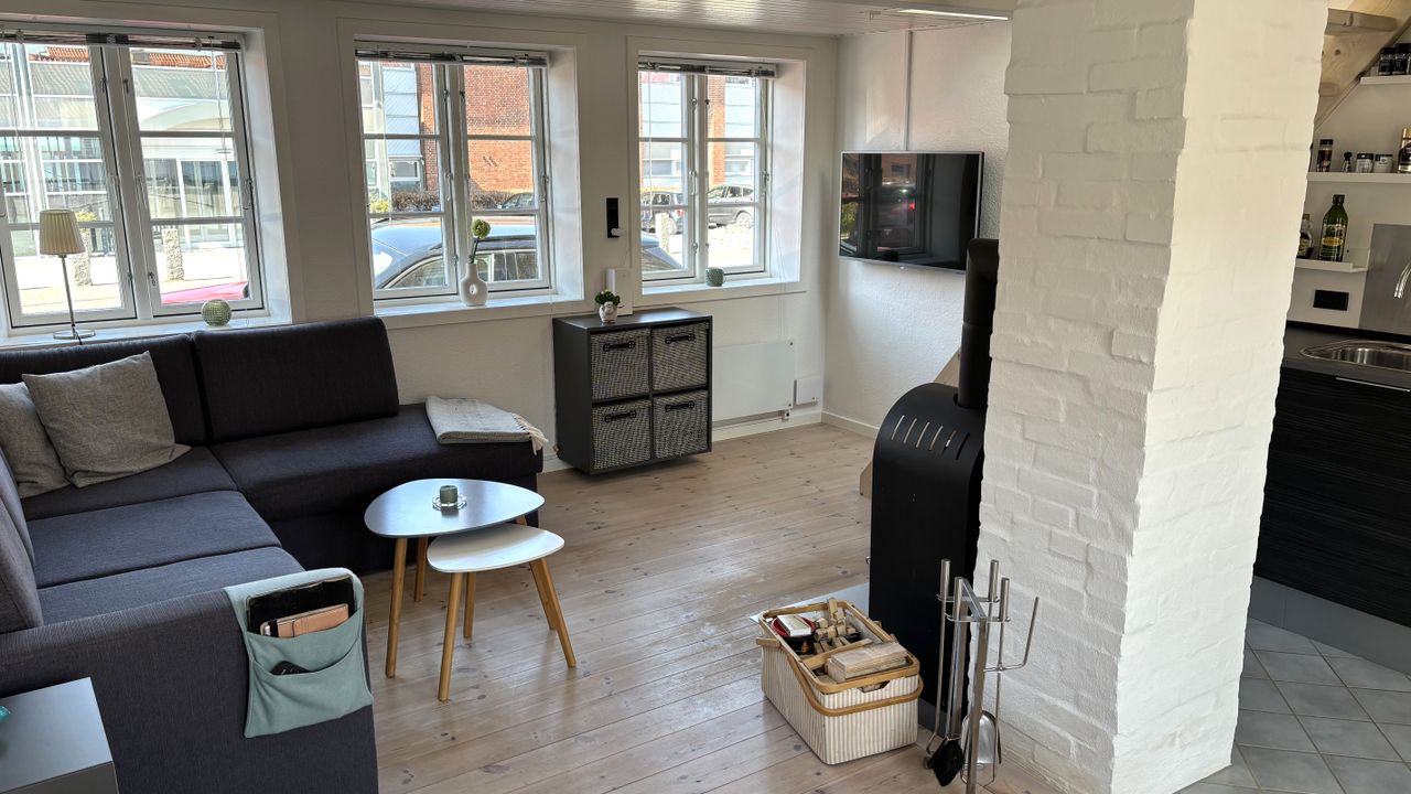 Køkken i åbent plan til 3-fags stue med brændeovn og opgang til 1.sal.
