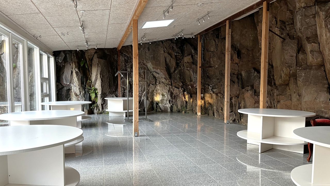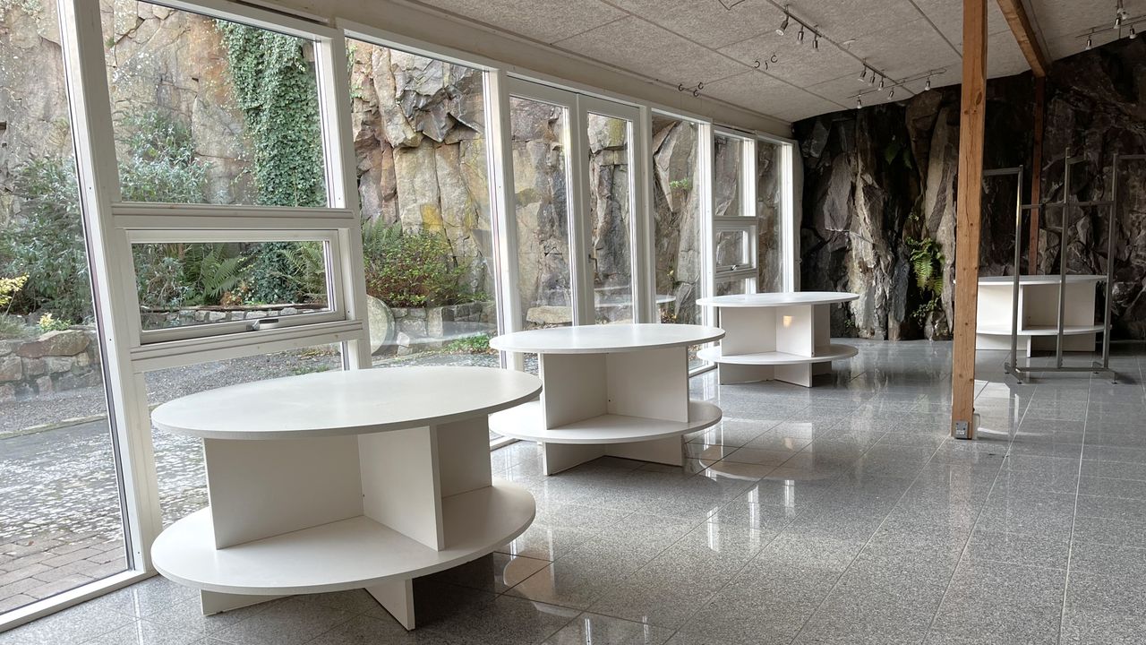 Fordelt i åbent plan til charmerende udstillingsbygning i gården.