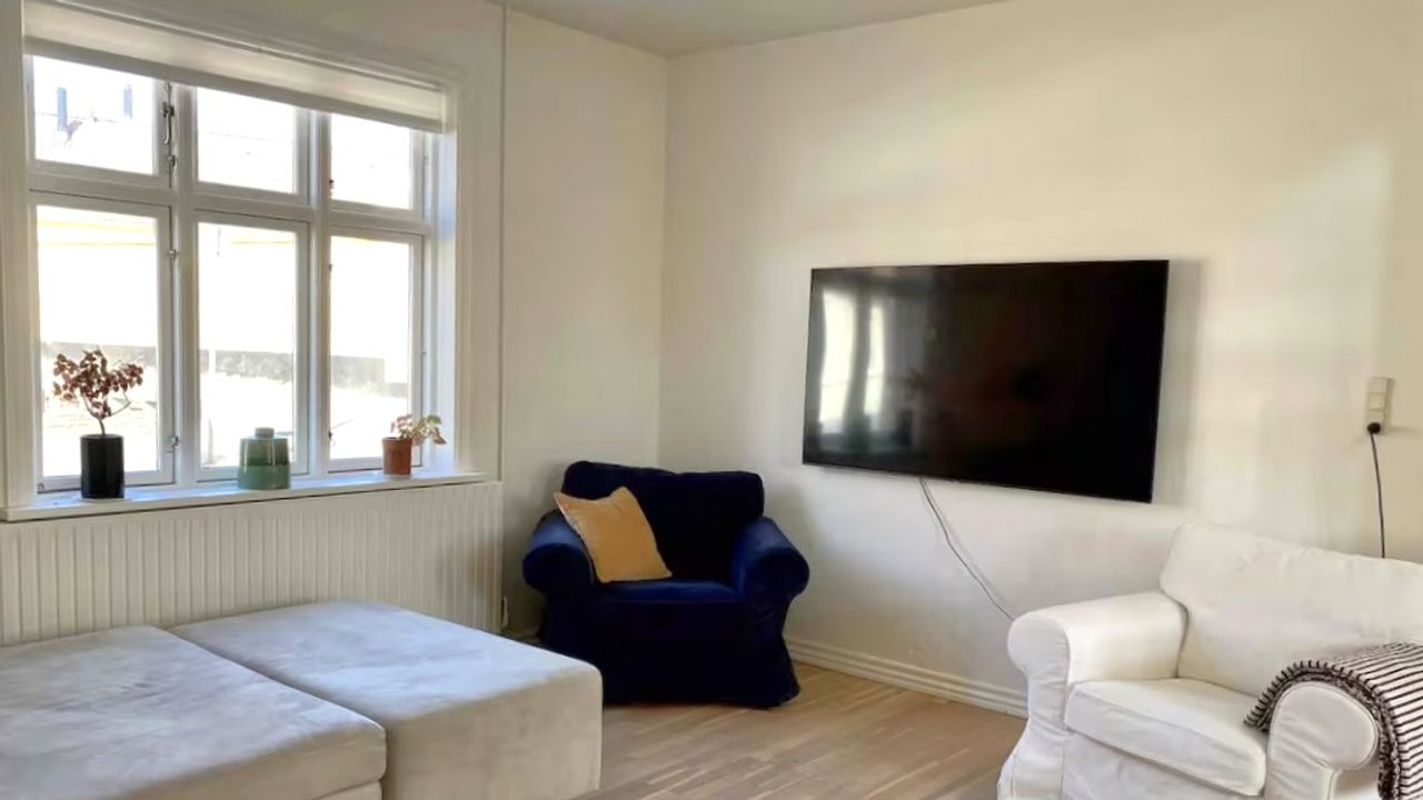 Vinkelstue med trappe til 1. sal og udgang til gårdsplads