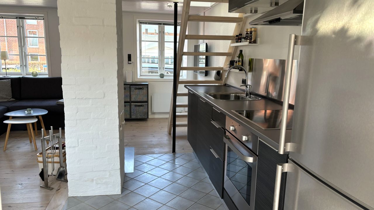 Køkken i åbent plan til 3-fags stue med brændeovn og opgang til 1.sal.